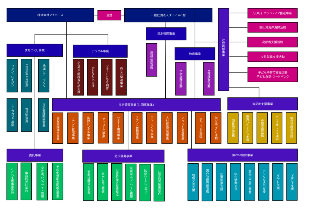 | 事業 | (1)ご当地キャラクターばいにゃこさんを活用した地域活性化事業 (2) ボランティア活動に関する運営及び支援に関する事業 (3) ボランティア活動に関するコーディネート及び交流に関する事業 (4) 地域イベントに関する運営及び支援に関する事業 (5) 地域イベントに関するコーディネート及び交流に関する事業 (6) まちづくりに関するマネジメント及びコンサルテイング事業 (7) まちづくりに関する情報発信及び広報に関する事業 (8) 地域コミュニケーションの推進に関する事業 (9) 地域コミュニティーの運営及び支援に関する事業 (10) 地域における社会福祉の推進に関する事業 (11) 地域における社会貢献活動の推進に関する事業 (12) 地域におけるデジタル活用の推進に関する事業 (13) 地域における人材育成およびマネジメントに関する事業 (14) 地域における特産品等商品開発に関する事業 (15) 子育て支援に関する事業 (16) 就職、就労支援に関する事業 (17)被災地支援および防災啓発に関する事業 (18)生涯学習および地域実践教育に関する事業。 (19) その他この法人の目的を達成するために必要な事業 |
